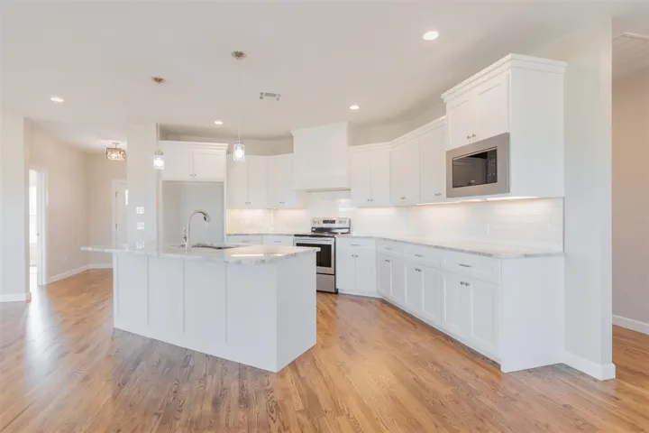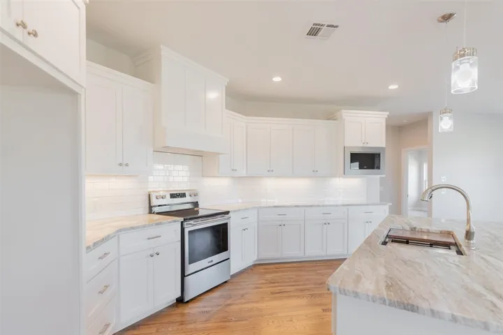 This 5 bedroom 2 1/2 bath New Construction Home has all the extra’s! Beautiful hardwood floors throughout the main areas of the home and office/4th bedroom. Livingroom features gorgeous stoned fireplace with stained mantle. The kitchen is bright with white subway tile and stunning countertops with plenty of storage. The bedrooms have huge closets and bathroom between a double vanity with tile tub/shower. The 1/2 bath and mud room have fun tile floors along with locker style storage. The primary bedroom has door to covered back patio. The bath has stunning tile floors and shower. Built-in and bench in shower. Double vanity and gorgeous countertops. The closet features built-ins and lots of shelving/cubbies. All of this sits on 1/2 acres and is priced to sell!