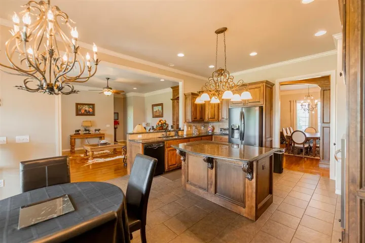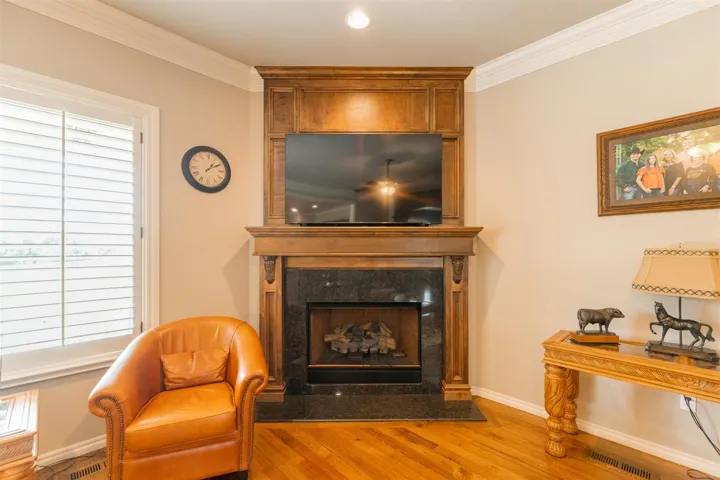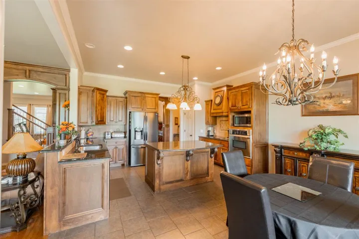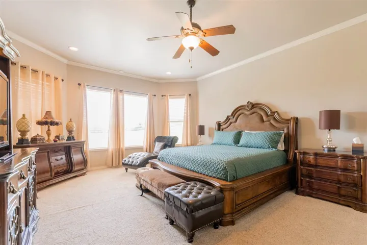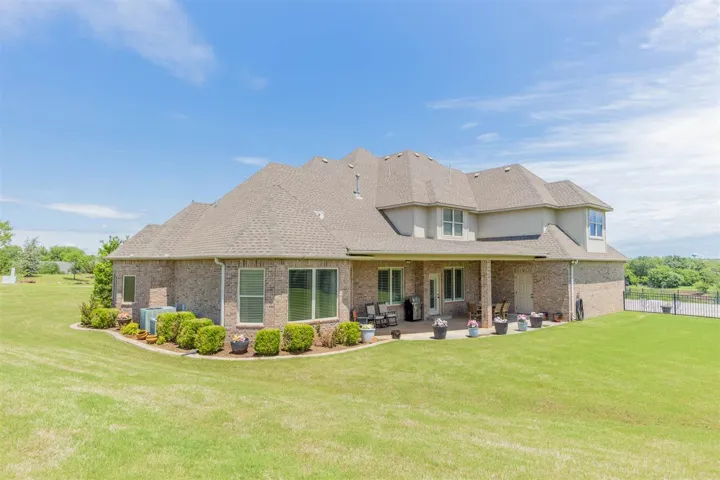 Welcome to 1315 Falls Drive; where luxury meets comfort with an abundance of space. 2-Story home featuring an Elegant Kitchen with Granite; custom cabinetry, center island, Breakfast Nook, & all the amenities a Gourmet kitchen would expect to have. Formal Dining large enough for 10-12 seating table with hutch space. Downstairs features open living area with gas log fireplace; picturesque windows overlooking massive backyard but still cozy for movie nights. Private study with hardwood flooring or 2nd living area. Half Bath. Huge Laundry Room. 4th bedroom or another study. Primary suite and 4th bdrm downstairs. Primary suite with en-suite bath. Bath features separate double sinks; enclosed soaker tub, walk in shower plus walk in closet. Upstairs there are 3 luxury sized bedrooms with walk in closets; full bath, tremendous storage space, flex room (bonus room), walk in attic storage & balcony views. Outside has large lot (room for pool & spa); shop building with electricity & insulated. 3 car garage is generous in size with walk in Storm Shelter. Sprinkler System. Just finished new landscaping. Covered back patio. This quiet elegance is ready for a new owner.