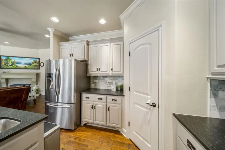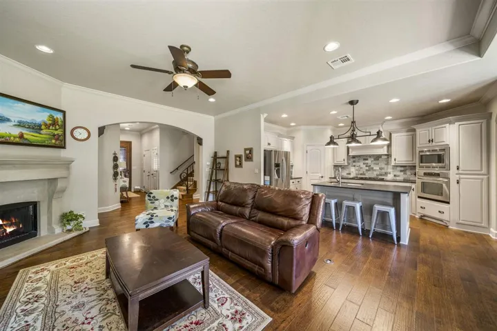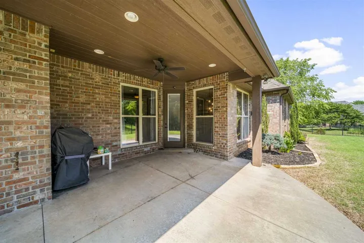 Serene green space views and sense of privacy is a rare find in Stillwater’s sought after Berry Creek neighborhood. Yet here you are! This stunning Greg Avery built home is situated on a hard to find premium lot. The captivating exterior features a refined combination of brick, stucco, and rock. The quality craftsmanship is evident throughout, as you step inside hardwood floors expand the entry to the open living area, you will notice the soaring ceilings, and tall windows that create an inviting sun filled space. The living room, centered around a cozy fireplace, flows seamlessly into the heart of the home. The kitchen is equipped with center island, stunning granite countertops, beautiful tile backsplash, and top-of-the-line stainless steel appliances, perfect for culinary enthusiasts and entertainers alike. Enjoy the large, covered patio accessible from the living area, equipped with canned lighting, ceiling fan, and gas grill hook-up, an ideal spot for outdoor entertaining and relaxation. The private master suite is a true retreat, featuring a spacious bedroom, a large walk-in closet, and an adjoining master bath with luxurious finishes. For added convenience, the master closet connects directly to the laundry room, streamlining your daily routine. Adjacent to the laundry is a convenient built-in desk alcove, offering a hidden workspace just off the entry, a nice addition for those who work from home or need a dedicated study area. All bedrooms are thoughtfully situated on the first floor, ensuring easy access and comfort. The secondary bedrooms share a stylish Pullman bath, with separate sinks allowing for both functionality and privacy. Upstairs, you will find a versatile bonus room with a half bath, ideal for a home theater, playroom, or additional guest space. Wood, tile, and hard-surface flooring run throughout the entire first floor, adding elegance and durability. The property also includes a 3-car garage with a newly added storm shelter, for peace of mind. Meticulously maintained, this thoughtful layout includes ample storage, and offers a blend of luxury, comfort, and functionality, perfect for modern living. Schedule your own private tour today!
