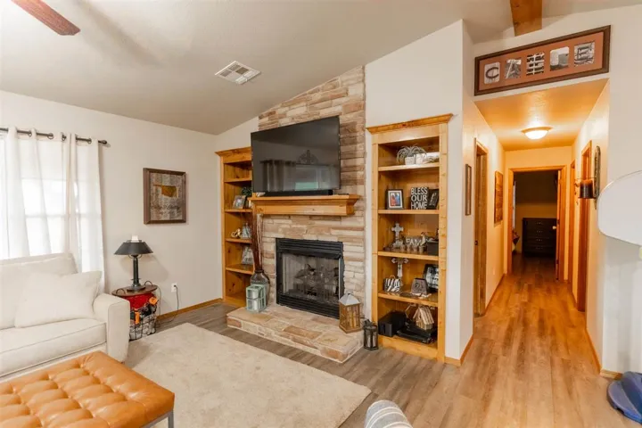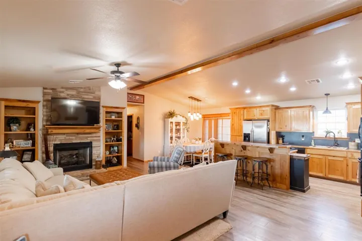 A Quiet Country Lane leads to this carefully preserved, 5- acre bit of Americana. Set on a slight knoll with a beautiful view. Property has a House; a Guest House, 30×50 Shop, fenced area for livestock, pool, plus room for whatever you may want! House was built in 2017 with 4 bdrm split arrangement. Open concept in living/dining/kitchen area. Living area has fireplace with stone veneer surround; built in cabinets, & beautiful flooring. Kitchen has center island with bar eating. Dining off of kitchen is roomy enough for table & hutch. 3 guest bedrooms with generous sized closets in each. Guest bath with double sinks; tons of storage, & shower/tub combo. LVT flooring throughout (very pretty). Primary suite with large walk in closet plus en-suite bath. Primary Bath consists of double sinks; soaker tub, large walk in shower, & a lot of storage. Laundry room deluxe has sink; hanging rack, extra storage plus room for a folding table. GUEST HOUSE is super functional with living area; kitchen & dining area. Separate bedroom with en-suite full bath. Separate mini unit for heat/air. 30×50 shop with electricity & concrete flooring. Separate fenced area for your priced livestock; pets, etc. Perimeter fencing. Above Ground Pool with awesome decking for fun in the sun! Fire Pit. All of this on 5 acres and still plenty of room for more. Very well maintained and Move In Ready!