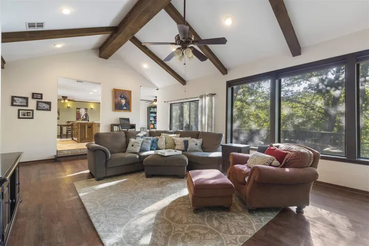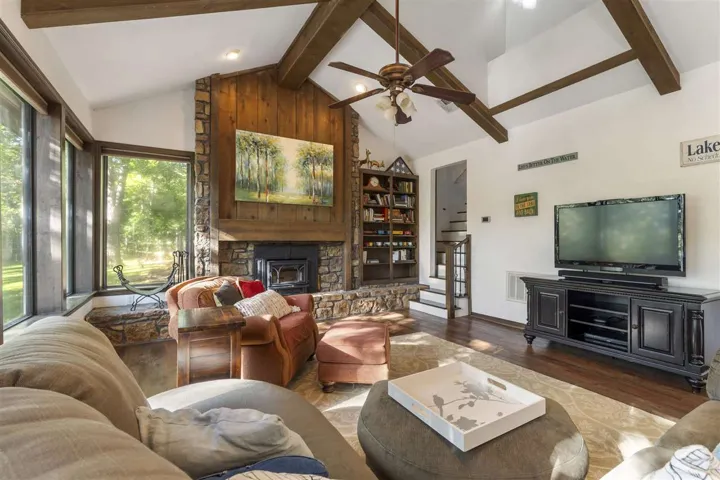 Seclusion and privacy on this beautiful property in Nottingham on 4.22 acres. Wrap around backyard deck, and fully fenced backyard. Peaceful park like setting surrounded by oak trees. Inside you will find the kitchen you have always longed for. Brett McKee construction completely gutted and redesigned the kitchen space with large granite island, pull out shelves, tile backsplash, pantry and all upgraded appliances, exhaust vent to the outside too. Clear view of the out of doors, into play room, dining room and living room: this kitchen is the centerpiece. Step down living room, luxury vinyl wood look floors, Vaulted, beamed ceiling with native stone wall with firebox, built in shelving, and a hearth for seating. Three bedrooms, jack n jill bath, half bath and beautiful primary bedroom ensuite with access to the deck are on the south end of the house. One bedroom upstairs which is currently used as an office and excercise room. High speed centranet fiber is available. Walk-in storm shelter and an area for workbench are in the garage. Outbuilding has electricity to it. Shop and compare, this could be the one you have been waiting for!
