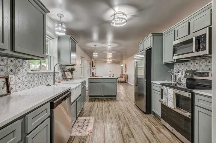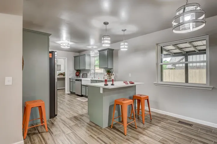 A whole home remodel, redesign and ready for you! This home in a well established neighborhood boasts a flexible floorplan with a 2 living and 2 dining options. It has 4 bedrooms, 3 full bathrooms (2 with tub/shower and 1 walk in), 2 car garage… all situated on a desirable corner lot. Enjoy the gorgeous updated fixtures and finishes throughout. The kitchen has an island, farmhouse sink, refrigerator, double oven with an air fry option and darling backsplash. A third full bathroom with a walk in shower and 2 vanities has been added. There are two hall trees… located at the front door and the back door. Other NEW items include: windows, appliances, wood look tile throughout the entire home, interior doors, cabinets, guttering, front porch wood columns, countertops, lighting, paint, epoxy garage floor, downlights, mailbox, basketball goal, garage door opener, driveway, extended back patio, etc. The new covered patio and new fence provide for the perfect, peaceful outdoor retreat.