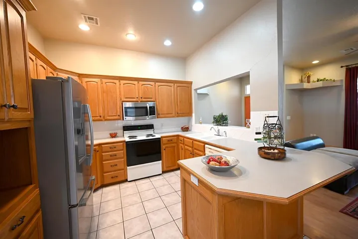 New carpet November 2024. Exterior brick repair on the north and south sides of the house have been repaired. This unique floor plan boasts of the open living, dining and kitchen concept. The living room features high ceilings, a gas fireplace insert, and unique architectural beam areas, perfect to display your decorating design flair. The kitchen has newer stainless refrigerator and microwave over the range. Rarely will a home in this area include the primary bedroom which opens to the back patio. The front of the house faces east and features a mature shade tree. The property is located just blocks from shopping, Boomer Lake Park, and Cimarron Turnpike.