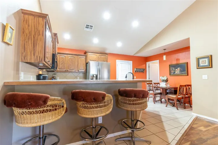 Terrific 3 bedroom/2 bath home in Crestwood Estates on corner lot. Full brick for ease of maintenance. Kitchen and living room have vaulted ceilings. Large U-Shaped kitchen has loads of cabinetry and counterspace, including a wrap-around bar. Stainless steel refrigerator stays with acceptable offer! Hand-scraped look on engineered wood flooring throughout living areas. Primary bedroom has trayed ceiling and en suite bathroom has beautiful new walk-in shower. Fully privacy fenced-in back yard has large patio for cookouts or a hot tub. The yard backs up to a large common green space with beautiful trees. Quiet yet accessible to OSU and shopping. Come call me HOME year-round and for those OSU game weekends. Go Pokes!