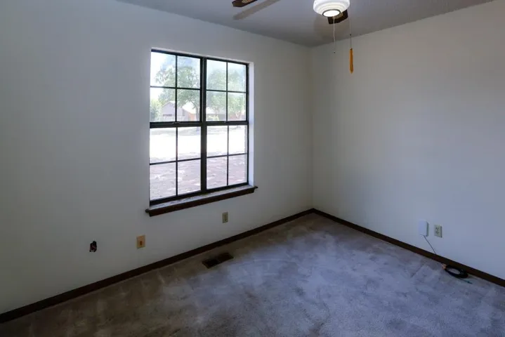 Great Value! This sturdy brick home is located in an established neighborhood, has 2 living areas, a spacious dining and kitchen and a 2 car garage! The front living room has a picture window, a wood burning fireplace and newer laminate flooring. The dining and kitchen are built for entertaining! Lots of counter space and a fabulous pantry space. The den is super cozy with paneled walls, a wood stove, and sliding glass doors leading to the covered patio. The bedrooms and baths are located on the south side of the home. The primary suite has an open vanity and a newer accessible walk-in shower. The fenced-in back yard has a water feature and an outbuilding. Most of the rooms have fresh paint! The home has been professionally cleaned and is ready to move in.