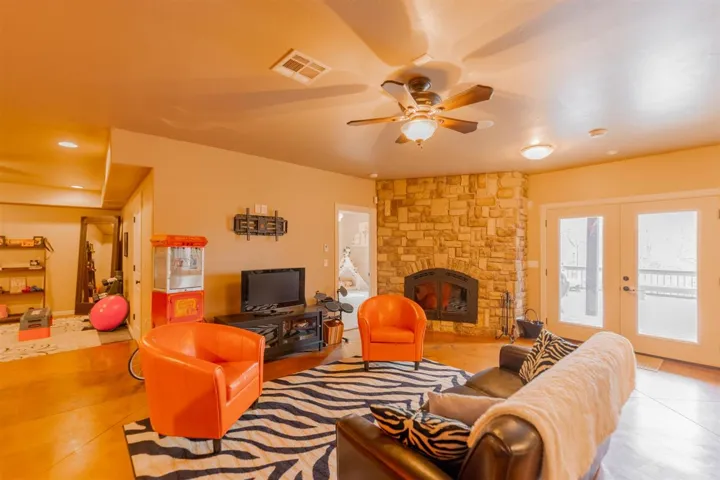 THIS BEAUTIFUL, PRIVATE & SPACIOUS HOME AWAITS YOU! It is the “WOW” home you have been looking for! This custom home was designed and built in 2010. There are just too many amenities to list but here are a few… There are 3 generous size bedrooms; or could very easily be 4 with a small wall addition. Open living room with 10 foot tall ceilings and 8 foot tall doors. Dining/kitchen also has an open concept with granite counter tops and custom back splash. Primary suite with balcony, 9 foot ceilings, remote lighting, remote gas fireplace and lots of space. Primary bath has custom double sinks, walk in tile two headed shower, huge Jacuzzi tub with chandelier. Washer and dryer in walk in closet. Downstairs features-stained concrete in the large game room, built in bar area, wine cellar and a second laundry room. Carpet in the theater room and bedrooms. Also has a covered patio with propane hook up for bbq pit and or fire pit. There is a secret safe room with finger print access and surround sound throughout the house inside and out. Two balconies overlooking the spring fed pond. Oversized garage. Front yard landscaping in place & back yard retaining walls. 1/2-acre lot. View of water. Mud room off of kitchen. Double ovens in kitchen plus walk in pantry. A lot of built ins and crown molding. Three fireplaces (gas in living area and primary bedroom, wood burning in downstairs living area). Spray foam insulation make whole house electric avg $150/mo, 2 outdoor hot water faucets. A must see to know what all is here. ADT alarm system. Outdoor Cameras & Permanent Christmas Lights included. Back of property looks over a two-tier retaining wall to a 6 acre spring fed pond full of fun fishing. What the seller loves about this home EVERYTHING… INSIDE & OUTSIDE THERE IS SO MUCH ATTENTION TO DETAILS!!!