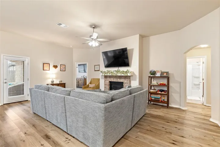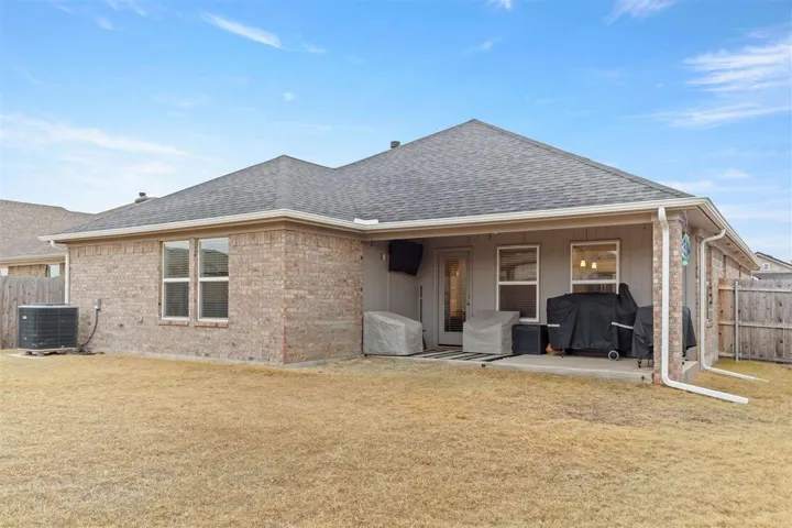 Discover your dream home, just completed in September 2022 by Ideal Homes, nestled in the desirable community of The Canyons. This stunning property features three spacious bedrooms, a dedicated study, and a versatile “flex room” that can serve as a formal dining area, a second living room, or a playroom, perfect for your lifestyle needs. Conveniently located across the street from a playground, serene pond, and common area, this home offers both comfort and convenience. As you step inside, you’ll immediately understand why this floorplan is so well loved. The open layout showcases an open floorplan, split bedrooms, and impressive 10 foot ceilings, creating a welcoming and airy ambiance. Luxury vinyl plank flooring flows seamlessly through the entryway, living room, kitchen, formal dining room, and breakfast area, enhancing the beauty of the entire space. The expansive living room, complete with a cozy fireplace and plenty of windows for natural light, is open to the kitchen and breakfast room. The kitchen, adorned with stunning Quartz countertops, white painted cabinetry, a large central island, stainless steel appliances, sizable pantry, and a gas stove, is sure to inspire culinary creativity. The study, located just off the entryway, features elegant glass French doors and two large windows that flood the space with natural light, ideal for productive work sessions. The primary bedroom is a true retreat, accommodating a king size bed and boasting a generous walk in closet. The bathroom is equally impressive, featuring double sinks and a beautifully tiled walk in shower. Step outside to enjoy your private outdoor oasis, complete with covered patios in both the front and backyard, enclosed by a privacy fence. Additional features added to the home include: home gutters for water management; a 6-8 person in-ground storm shelter for peace of mind; the garage was custom designed to extend an additional 4 feet in length, ensuring ample space for all vehicles to fit comfortably; an exterior garage side door was added plus exterior concrete; Custom two inch blinds cover all home windows for privacy. This energy efficient home is packed with perks, including a limited structural warranty valid until September 2032, a fresh air ventilation system to combat allergies, and double pane vinyl framed windows. The Canyons community provides a tranquil environment while keeping you just minutes away from shopping and dining options. Enjoy access to a large community fishing pond, sidewalks for leisurely strolls, and a vibrant playground. Plus, this home is situated in the highly sought after Richmond school district! Don’t miss out on this incredible opportunity, schedule your viewing today! Plus check out the virtual tour online!