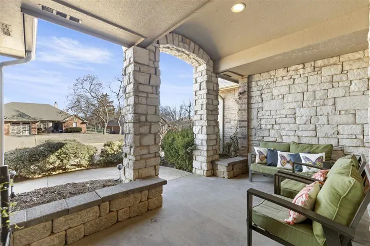 Just in time for Spring– a terrific 4 bedroom, 2 1/2 bath, 2-car garage home in Southwest Stillwater boasting the Sangre Ridge Elementary School District! From the moment you arrive, you’ll appreciate the charm and curb appeal of a stone covered front porch and sitting area that welcomes you to an easy flow floor plan with split bedroom arrangement. Inviting arched windows give the home lots of natural light highlighting a spacious dining area on the front of the home open to a roomy kitchen. The kitchen offers light cabinetry, stainless steel appliances, a true hood for the cook in the family and a large eating bar bordering the spacious family living area. The family living space is roomy and boasts a lovely fireplace with brick hearth, crown molding, neutral colors and French door access to the covered patio. The primary suite is tucked away in a private corner of the home offering a large sleeping area, two walk-in closets, large soaker tub and separate walk-in shower. Three more roomy bedrooms and centrally located hall bath offer great space for a growing family or overnight guests. The interior space includes a cozy powder bath and large laundry room with sink and built-in folding counter. Great for children, pets or anyone who has allergies, you’ll appreciate the hard surface flooring throughout the home with wood flooring featured in the main living space and bedrooms, and tile in the kitchen/dining area and bathrooms. The south facing, fenced backyard is private and spacious, perfect for enjoying the great outdoors. Finishing touches include an in-ground storm shelter and garden shed for extra storage.