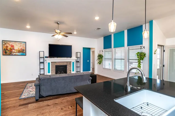 Discover this stunning, like-new home in the highly sought-after Canyons subdivision! Featuring 3 spacious bedrooms plus a versatile flex room that can serve as a 4th bedroom or home office, this home perfectly blends comfort and functionality. The open-concept floor plan offers a desirable split-bedroom design, seamlessly connecting the modern kitchen to the inviting living area—anchored by a cozy fireplace. The kitchen is a chef’s dream, boasting elegant granite countertops, a stylish tile backsplash, and an expansive island with seating—perfect for entertaining while preparing meals. Step outside to your private backyard oasis, complete with a covered back porch, an extended patio, and a fully fenced yard—ideal for outdoor gatherings or peaceful relaxation. The generously sized bedrooms provide plenty of space, while the luxurious master suite features a large walk-in closet and a spa-like master bath. Don’t miss this incredible opportunity to own a beautifully designed home in a prime location!