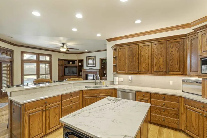 This stunning custom Ron Walker home, located in the desirable Oak Trail addition, features a thoughtfully crafted floor plan that provides spacious and comfortable living. Tucked away in a cul-de-sac, this remarkable residence includes the primary living areas and four bedrooms on the main floor, while the second floor hosts an expansive bedroom (which can also serve as a bonus room) complete with a kitchenette and a full bathroom. The layout is designed for maximum functionality. Upon entering, you’ll find a stylish formal living area and dining room that radiate warmth and elegance. The large kitchen is equipped with all the details such as an eat-at bar, island, granite countertops, dual ovens, warming drawer and is perfectly situated in the heart of the home. It opens to the family room and is accompanied by a cozy breakfast area. The luxurious primary suite features a comfortable sitting area, direct patio access, and a spacious walk-in closet with custom shelves and drawers. The primary bathroom boasts dual vanities, a large soaking tub, and a walk-in shower. The three additional bedrooms on the main floor come with generous closets and Kirtz Shutters. One bedroom is conveniently located next to the primary suite and can function as an office or flex room, while the other two bedrooms are situated on the opposite side of the house, sharing a full bathroom. The second floor further enhances the living space with a sizable bedroom or bonus room, kitchenette, full bathroom, generous walk-in closet, and a cedar closet. The backyard serves as a tranquil oasis, featuring a spacious covered patio with remote-controlled screens and a stunning fireplace at its center, perfect for year-round enjoyment. The gunite saltwater pool adds to the charm of this backyard retreat and includes a remote-controlled heating cover for convenience. Additional features to highlight about this stunning home include: ample storage with custom built-ins throughout, a walk-out attic, three air conditioning units, two hot water tanks, a complete irrigation system, a security system, a storm shelter, and an invisible pet fence surrounding the pool. This breathtaking home truly impresses with its upscale features, quality craftsmanship and fantastic floorplan. It meets all your needs, offers golf cart access to the Stillwater Country Club, and is situated within the Westwood school district.