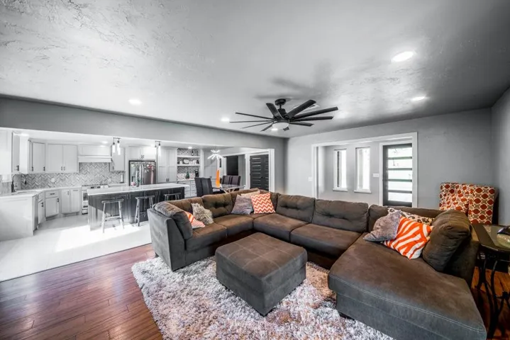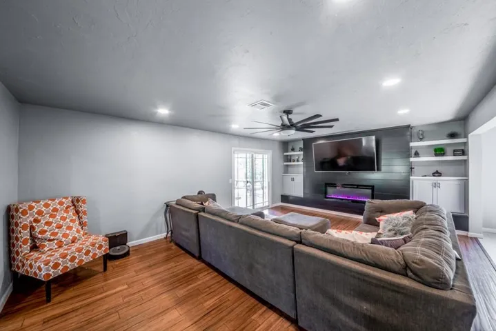 Breathtaking Modern Transformation | 2,621 SF | 4BR/2.5BA | 2-Acre Estate Welcome to 504 Tan Tara St., where mid-century roots have been reimagined through a complete, top-to-bottom renovation. This stunning 1975 Spanish Ranch Home has been transformed into a contemporary masterpiece, offering the perfect blend of spacious design and modern luxury. Contemporary Open-Concept Living The heart of this home showcases a magnificent open floor plan where the living, dining, and kitchen areas flow seamlessly together. Rich hardwood flooring contrasts beautifully with light walls and textured ceilings, creating a bright, airy atmosphere throughout. The spacious living area features a designer accent wall with a modern electric fireplace and built-in entertainment center—the perfect setting for both everyday relaxation and sophisticated entertaining. Chef’s Dream Kitchen The completely renovated kitchen is a culinary masterpiece. Pristine shaker cabinetry is complemented by sleek brushed nickel hardware, while the stunning herringbone backsplash adds visual interest. High-end stainless steel appliances, including a French door refrigerator and professional-grade range, make cooking a delight. The expansive center island with quartz countertop serves as both a functional workspace and casual dining area, illuminated by modern pendant lighting. Luxurious Primary Suite The spacious primary bedroom offers a peaceful retreat with plenty of natural light and custom built-ins that maximize space and storage. The en-suite bathroom has been completely transformed with marble-inspired tile, a contemporary shower, and thoughtful designer touches. Versatile Additional Bedrooms & Living Spaces Three additional bedrooms provide flexible space for family, guests, or home offices. Each room features the same attention to detail found throughout the home, with warm wood flooring, textured ceilings, and ample natural light. Custom built-in storage solutions offer both functionality and style. Remarkable Outdoor Living Step outside to discover the true jewel of this property—two full acres of private, fenced land. The covered patio with exposed wooden beams creates a spectacular outdoor living space perfect for year-round enjoyment. Property includes a newly installed concrete driveway, sidewalk, patios, and gravel drive which leads to a detached garage, while the expansive grounds offer endless possibilities for gardening, recreation, or future additions. This rare combination of spacious living (2,621 square feet), contemporary design, and expansive acreage offers the ultimate in modern suburban living. Don’t miss this opportunity to own a completely renovated home with room to grow, entertain, and create memories for years to come. **Owner is a Licensed Agent Video Tour: https://youtu.be/BXKqng3DfqQ