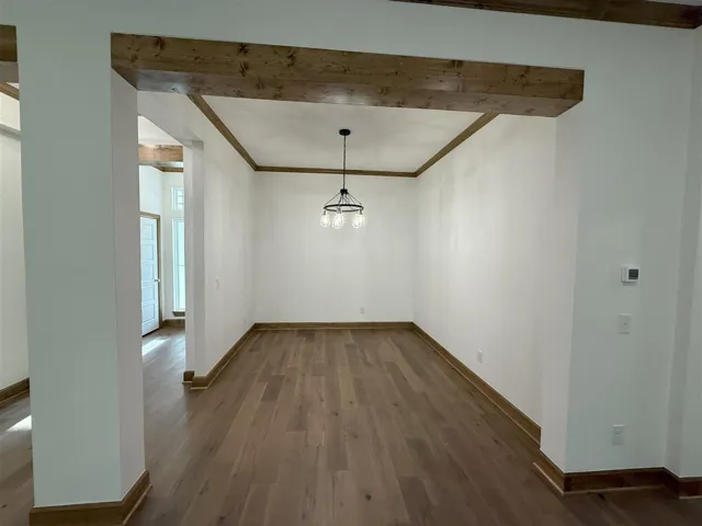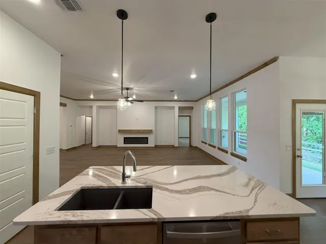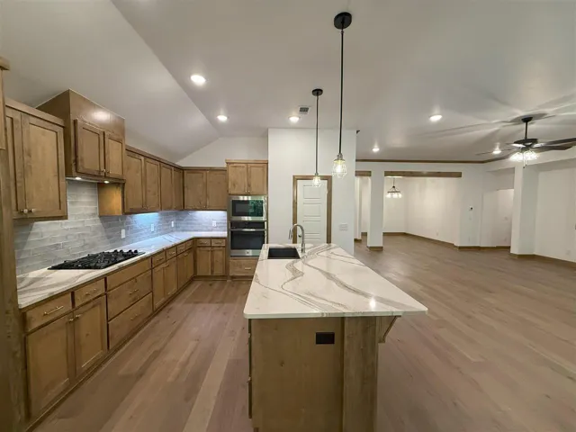 Practically new, never lived in 3 bedroom home in the Stillwater neighborhood of Teal Ridge! This home features an open living/dining layout with an electric fireplace, wood flooring, lots of natural light throughout, and a formal dining area/flex space near the front door! The kitchen boasts a nice size island, quartz countertops, built-in stainless appliances with gas range, and a large pantry for storage! SPEAKING of storage, the window-lit nook on the side of the 2-car garage is perfect for keeping the lawn mower or bicycles out of the way! You’ll love the large laundry room with the folding surface and cabinets, along with the mud bench by the garage. The primary suite offers a spacious walk-in closet, soaking tub, large tiled shower, and double vanity with framed mirror! Enjoy the nice weather on the covered front porch or the back patio that opens up to a greenbelt and trees! The home has briefly served as a model and is now ready for a family to make it their own! Owner licensed.