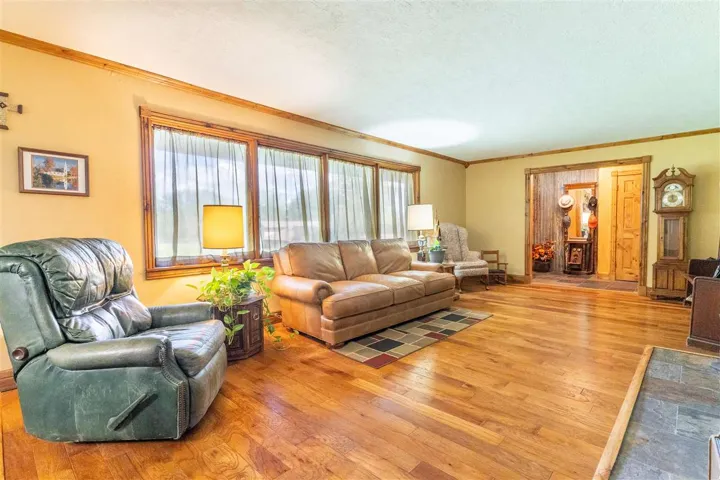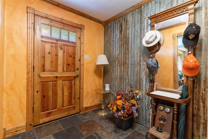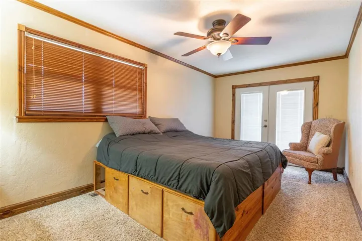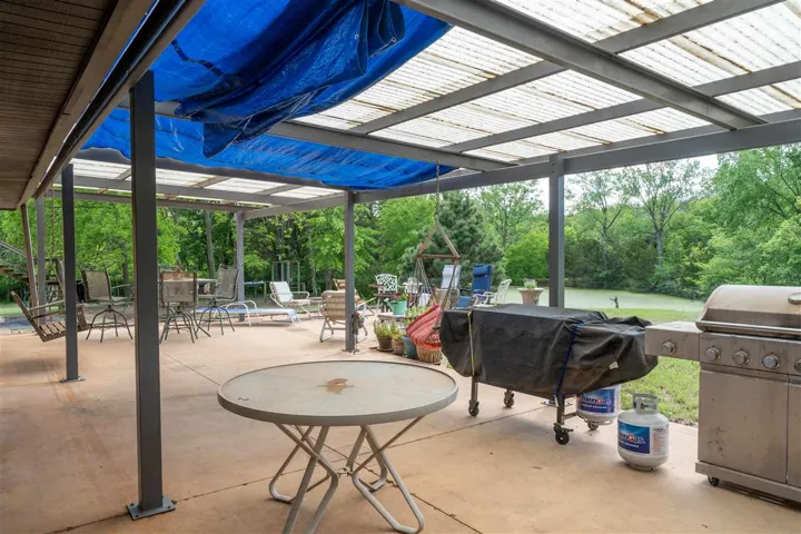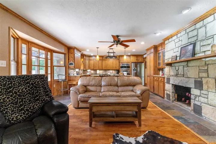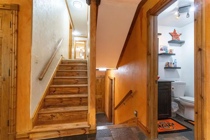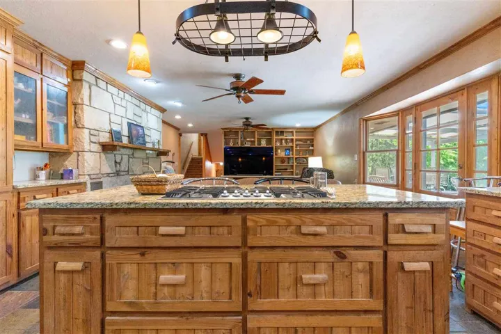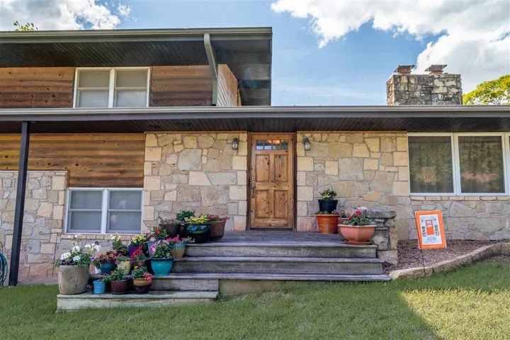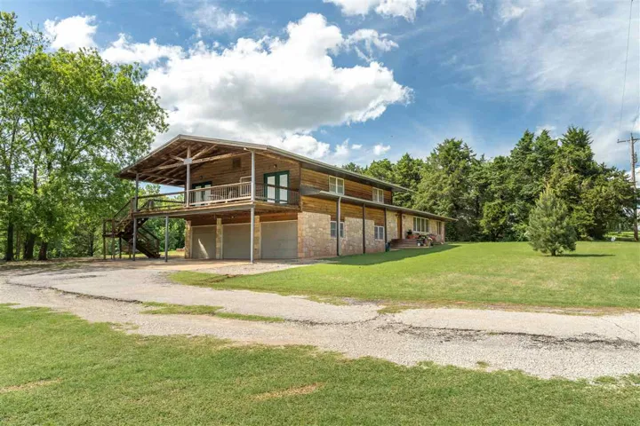 Happiness awaits! This property has it all! 3.5 acres and a private pond surrounded by tall trees with a sunset view to be enjoyed from the patio and a sunrise view to be enjoyed from the deck. Rustic casual decor; a wonderful house for relaxing and entertaining! Updated and well cared for, this home has never been available on the market before. Fantastic kitchen with large granite island and countertops, slate floors, custom cabinets, convection oven and microwave, double drawer dishwasher, touch faucet, with an eating bar. The kitchen has been totally renovated, and it is a chef’s delight. Kitchen open to living area, and patio doors are near for outdoor dining. Natural light streams in. Three bedrooms are up a short flight of stairs (the south half of the house is two levels, the north half of the house is one level; it is a tri-level home). Primary bedroom and closet are large and the adjoining bath has a jetted tub and separate shower. Marble tops, custom cabinets. There are glass exit doors to the large covered second floor deck. Downstairs, there is another bedroom, a half bath, plus an oversized laundry room, with a sink. The three-car side entry garage has a storm shelter, if needed, in the floor of the garage. Two heat and air units, one for the north half of the house, and one for the south half. One tankless gas water heater. Engineered hickory wood floors, Anderson windows. This small acreage is a choice lot, last one on the right on a quiet dead end street in an established neighborhood. Walking path back into the trees, firepit, play area and the pond has a dock. Country feel, yet convenient location and all city services. Sangre Elementary. It’s the best of both worlds with room for everyone!