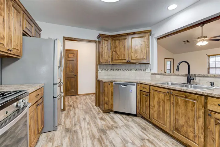Discover this beautifully crafted home situated on 1.4 acres, offering the perfect blend of comfort and functionality. Featuring 4 bedrooms and 2.5 bathrooms, this property boasts stunning knotty alder kitchen cabinets, a warm and inviting fireplace in the living room with windows allowing natural light to shine through. The main floor hosts a large primary suite with direct access to the back patio—ideal for relaxing or entertaining. There are two secondary bedrooms with a split floorplan from the master. While the fourth bedroom upstairs can serve as a bonus room, offering flexibility to suit your needs that includes plumbing for a bathroom to be completed. Enjoy the privacy of a luxury wood and pipe fence, ensuring a peaceful retreat. A true standout is the 30×70 custom shop with two overhead doors, with partially finished 600 square foot living quarters, making it perfect for work, storage, or additional living space. This home is designed for both comfort and functionality—don’t miss the opportunity to make it yours!