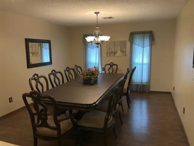 Great family home in the Sangre Elementary school district with large fenced yard, storage building and large covered patio will bring extension providing even more area for outdoor entertaining. The back door, which is new, from the kitchen opens to the covered patio and there is also a door leading from the garage directly onto the patio. From the front door, there is a tiled entry opening to the carpeted living room with gas log fireplace and pillars. The carpet in the living room was recently replaced and has been cleaned. The large primary bedroom has wood flooring and is to the left of the living room and has a built-in desk and shelves. The large master bath has double sinks, separate shower/tub area with a jetted bathtub, and large walk-in closet. Directly from the living room is a door to the kitchen with eating area, island with stove top, many built-in cabinets and countertop for serving, double oven, and tile floor in kitchen through the utility room. The dishwasher is two years old, new Formica counter tops, new backsplash in kitchen. To the right of the living room is the formal dining with large wood buffet with serving top, and wood floor. The perfect arrangement for large groups to circle from living room to dining room to kitchen and back around. Just off the formal dining room is a hallway with a half bath and separate laundry/utility room. Washer, dryer and refrigerator will remain with no warranty. Going up the carpeted stairs from the tiled entry is a nice wood floored area which would be ideal for an upstairs sitting area. A full bathroom upstairs with new cabinets and countertop. There is also a laundry shoot from upstairs bathroom down to the laundry/utility room. The first two upstairs bedrooms have entry to the deck that was replaced about five years ago and each have large walk-in closets. The next (4th) bedroom has a desk that will remain, and then the 5th bedroom is very large at the end of the hall which could also be used as study-bedroom, or playroom. Several rooms throughout the home have been recently painted. Ceiling fans throughout the house and patio. New guttering on front and back with screens. Shelving and work bench in garage. The formal dining room table and chairs could possibly be purchased.