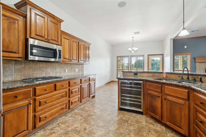 Welcome to your dream home in the highly sought-after Country Club Vistas! This gorgeous 3 Bed/2 Bath brick home offers breathtaking golf course views right from your own backyard! Imagine starting your mornings with a fresh cup of coffee by the fire pit and unwinding in the evenings while taking in the serene landscape—all without leaving home! Step inside to find a spacious living room featuring soaring 12-foot ceilings and a beautiful gas log fireplace, seamlessly flowing into the open-concept kitchen and dining area! The kitchen is a chef’s dream, boasting granite countertops, stainless steel appliances, a double oven, gas cooktop, and a wine fridge, making entertaining a breeze! The dining area is perfectly situated to enjoy stunning views of the outdoor living space and golf course! The master suite is a private retreat, featuring an elegant trayed ceiling and an amazing en-suite bath with granite double-sink vanities, a tiled walk-in shower, a luxurious jetted tub, and a must-see walk-in closet with custom shelving! The split floor plan ensures privacy, with the additional bedrooms located on the opposite side of the home—both generously sized! A conveniently designed laundry/mudroom is located just off the attached 2-car garage, complete with a separate utility sink and pantry closet for added storage! Home includes an alarm system, but monthly monitoring is optional for buyer! Step outside to the back patio, where a relaxing hot tub awaits, perfect for entertaining or simply soaking in the scenic golf course views! The custom upscale fencing provides security without obstructing the beauty of the landscape! The professionally landscaped yard is equipped with a sprinkler system to keep the flowerbeds lush and vibrant year-round! This exceptional home truly has it all—luxury, comfort, and an unbeatable location! Don’t miss your chance to live the golf course lifestyle you’ve always dreamed of! Call today to schedule your private showing!
