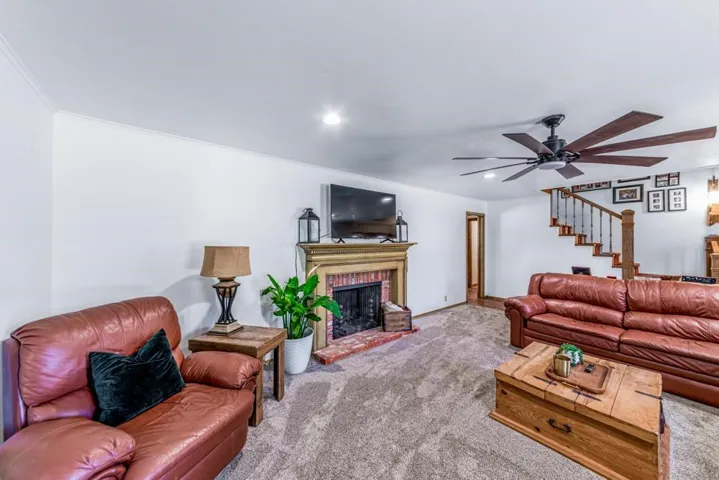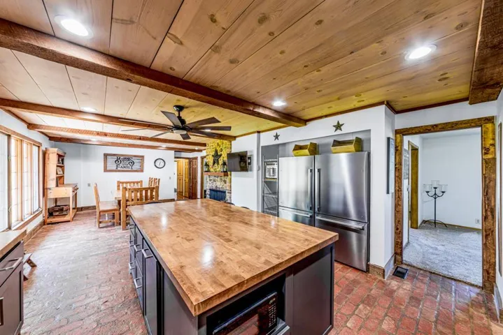 CHARMING 4-Bedroom Home on Spacious Lot with Stunning Kitchen Remodel and Warm and Cozy Inspired Living Space!. Nestled on a generously sized lot with mature trees and a convenient circle drive, this beautifully updated 4-bedroom, 2.5-bathroom residence offers the perfect blend of comfort, and timeless style. Step inside to discover a completely remodeled kitchen that’s functional and a chef’s paradise — featuring an impressive 8-burner stainless steel Forno double oven range, double side by side refrigerators, oversized island, and a sleek under-counter ice maker. The kitchen flows seamlessly into the cozy den, where brick paver flooring, rich wood beams, and a river rock masonry fireplace create an inviting, lodge-like atmosphere. The large living room is flooded with natural light from an abundance of windows, and there’s a spacious office just off the main living area — ideal for working from home or as a quiet retreat. You can choose either of the two bedrooms for the master suite which is located downstairs, ideal for guests. The downstairs bath has been fully remodeled with a glass walk-in shower, freestanding soaker tub, new tile flooring, and modern vanities. The bedroom on the East side is plumbed outside for an on suite master bathroom that owners did not have time to complete. Two additional bedrooms and a full bath are located upstairs, along with an oversized closet for plenty of storage. Enjoy year-round living in the 384 sq ft sunroom filled with natural light and surrounded by windows — perfect for a morning coffee or evening unwind. The bonus here is there is not a home behind you just a great view. Additional updates include upgraded electrical, new carpet and stylish new finishes throughout. This one-of-a-kind home combines character, convenience, and craftsmanship — a must-see! CALL TO VIEW TODAY!!! CK OUT THE VIRTUAL TOUR!