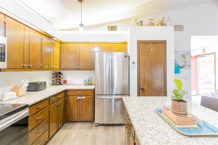 If you’ve been waiting for a sign to stop renting, or perhaps, just start fresh—this is it. Welcome to your 3 bed, 2 bath, 1,425 sq ft slice of Perkins paradise. This home has updates for days. New scratch-proof, pet-proof floors mean you can host a stampede of toddlers or a tap-dancing Great Dane and not lose your mind or your money. There’s new cozy carpet in all the bedrooms, and the kitchen? Dressed to impress with updated countertops and shiny stainless steel appliances—including the fridge—which all stay with the home. The vaulted ceilings give the living room that wow factor, while the fireplace is just waiting for your seasonal decor. The master bath has been fully remodeled and now includes a Bluetooth speaker and adjustable lights in the shower—because singing in the shower is more powerful with backup music and appropriate lighting! New ceiling fans in every bedroom, and fresh coat of paint through the entire house. All that’s left to do is move in! Other perks? HVAC replaced in 2020, brand-new hot water heater in 2024, total electric setup, and a mini split in the garage so you can finally finish that home gym/workshop/escape room. New guttering was also recently installed. Bonus: the deep freeze stays, and there’s even a Reolink camera system included. The big backyard is fully fenced with added privacy on three sides. Whether you’ve got kids, pets, or an inflatable pool collection, it’s got room for all of it. Raised beds on the North will stay with the home, as well. Basically, this house is like your favorite hoodie—comfy, reliable, and surprisingly stylish. Come take a look before someone else snags it!