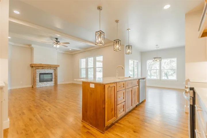 Stunning 5-bedroom, 3-bath home with a 3-car garage and 2,483 sq ft of beautifully finished living space. Enjoy serene views overlooking a gorgeous pond from the covered back patio, perfect for relaxing or entertaining. Inside, you’ll find wood floors in the main areas, a spacious living room with fireplace, and a chef’s kitchen featuring custom cabinets, granite countertops, and a walk-in pantry. The primary suite includes a luxurious tiled walk-in shower and huge walk-in closet with built-in shelving and organization systems. A large laundry room with sink and thoughtful storage throughout complete this exceptional home. You will find this builder pays extra attention to details in this home. Call today to set up a showing on this home which is hard to find!