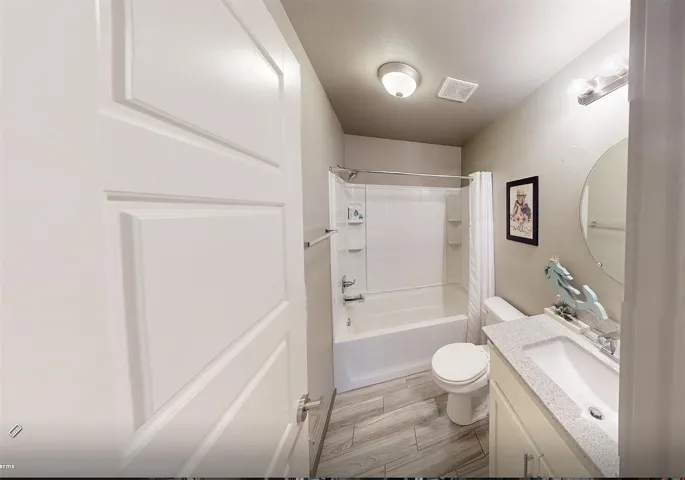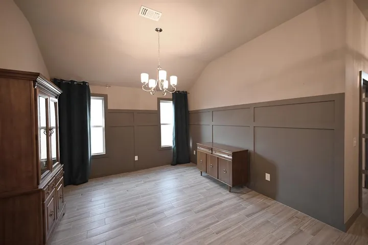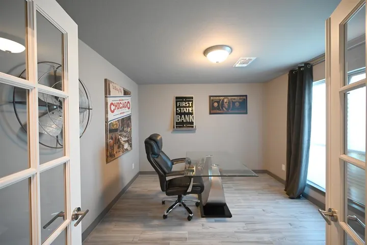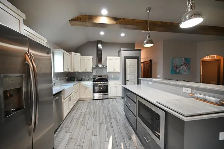 This single-story residence boasts a thoughtful layout with 3 bedrooms and 2 bathrooms spread across 1975 sq. ft. The heart of the home is a stunning kitchen with white cabinetry, stainless steel appliances, and a central island. The open-concept living area features exposed wooden beams, adding rustic charm to the contemporary space. Bedrooms are generously sized, with the primary suite spanning 200 sq. ft.. Additional amenities include a dedicated laundry room and office space. Throughout the home, wood-look tile flooring and neutral tones create a cohesive, modern aesthetic. Large windows allow ample natural light, enhancing the spacious feel of this well-designed property.