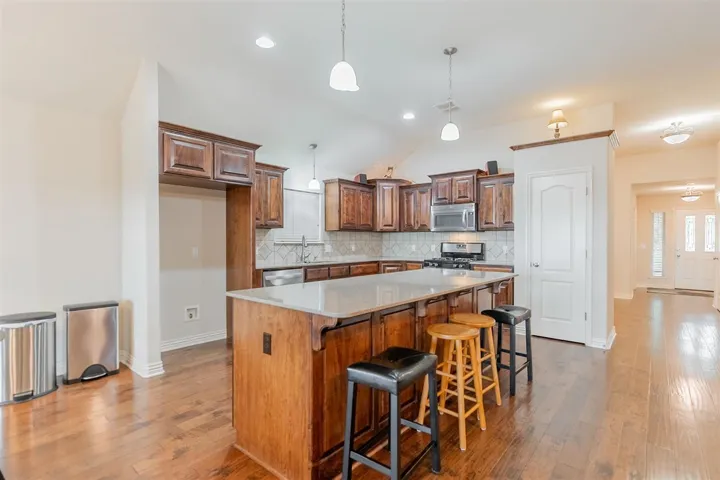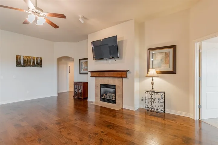 Welcome to 411 E Topaz Avenue, a beautiful home built in 2013 offering 2021 square feet of thoughtfully designed living space. From the moment you step inside, you’ll appreciate the open layout, abundant storage, and the inviting feel that makes this home truly special. At the front of the home, an office provides the perfect spot for working from home or managing daily tasks. A formal dining/living area flows seamlessly into the kitchen, which features a pantry and plenty of cabinet space to keep everything organized. The main living living room is anchored by a cozy gas fireplace, creating a warm and welcoming space for gatherings. The private master suite is a true retreat, complete with new carpet installed just last year, dual sinks, a walk-in shower, and a spacious walk-in closet. Two more bedrooms and full bath ensure comfort for family or guests. The home also includes a laundry room with extra storage, and a garage equipped with a storm shelter for peace of mind. Out back, you will love spending time on the extended, covered patio–ideal for entertaining or relaxing while overlooking the green space and pond. A 8-foot privacy fenced, partially new, giving the yard a fresh and secure feel. A sprinkler system helps keep the lawn lush and green year-round. Blending comfort, style, and convenience, this home is move-in ready and waiting for its next chapter.