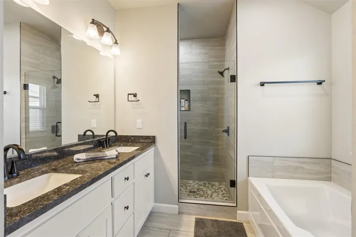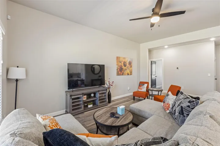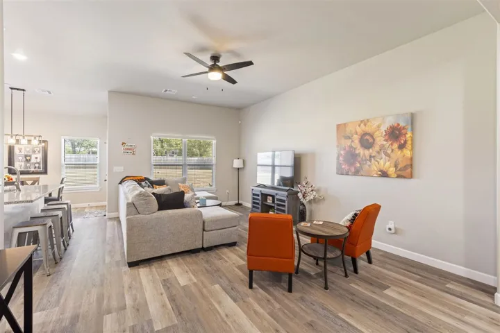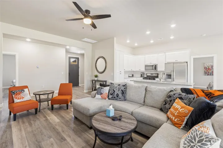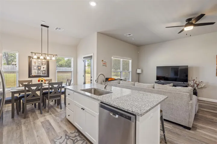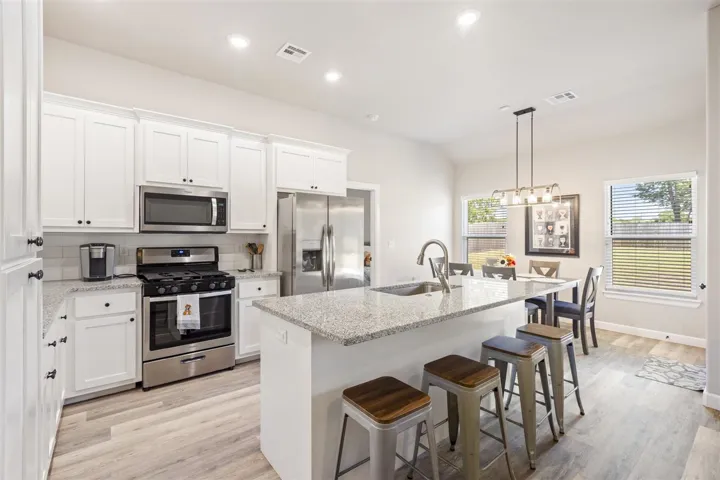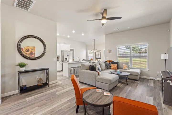 Welcome to this beautiful 4 bedroom, 2-bath, 2 car garage, just built in 2022 and thoughtfully upgraded throughout. Located on a low traffic street and no HOA. This home offers a blend of modern style, comfort, and convenience – all just minutes from Oklahoma State University, shopping, and restaurants. Step inside and discover an open concept floor plan that seamlessly connects the kitchen, dining, and living areas – perfect for both everyday living and entertaining. Buyers will enjoy the easy-care luxury vinyl plank flooring throughout the home and tiled bathroom floors for added durability. Tall ceilings with ample natural light create a bright, airy atmosphere. The kitchen features a large flat island, granite countertops, soft close white cabinetry, stainless appliances including a gas range, stylish tile backsplash, and recessed lighting. The primary bedroom is privately situated complete with an en-suite bath featuring a soaking tub, oversized tiled walk – in shower, and dual sink vanity with a granite counter, and generous walk-in closet. Bedrooms 2,3,4, are located on the opposite side of the home each with remote controlled ceiling fans and easy access to a full guest bath. Additional highlights include impact resistant shingles, hard wired security system w/ glass break feature, door chime, cameras, & able to control from an app, ring doorbell, Nest thermostat, Yale wireless front door keypad with remote access/control via app, 4 outdoor cameras with Wi-Fi app access and hard wired via HDMI to TV’s for additional live viewing, fully guttered, myQ enabled garage door opener w/camera/battery backup/keypad, black plumbing fixtures, 2″ faux wood blinds, spacious backyard, wall of storage cabinets in the hallway, separate laundry room with cabinets and folding counter, covered east-facing back patio with extended concrete slab, a sizeable driveway for extra parking, attic storage above garage, and more! Don’t miss this turnkey home with all the perks of a simple and easy move Plus so many extras!