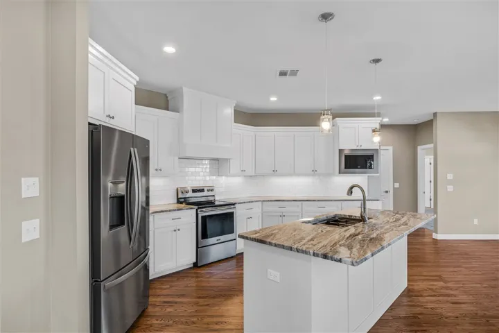 Beautifully home in highly desirable Trio Ridge. ONE STORY 5 bedroom, 2.5 bath, featuring stunning finishes throughout with open concept floor plan on a .50 acre lot with neighborhood ponds. As you enter the home you will find a great home office and timeless hardwood floors. The living room features stunning wood mantle fireplace. The main living openly flows into the kitchen and dinning room. The kitchen features granite island with bar seating. Quality detail in the cabinetry, walk in pantry and stainless steel appliances. The primary bedroom features a private ensuite featuring dual vanities, a whirlpool shower, and a separate tub. The primary bedroom has two separate walk-in closets. The other bedrooms are spacious with walk in closets. This home provides a unique room that serve many options. A must see!! The large covered back patio with privacy fence is great for hosting family and friends.