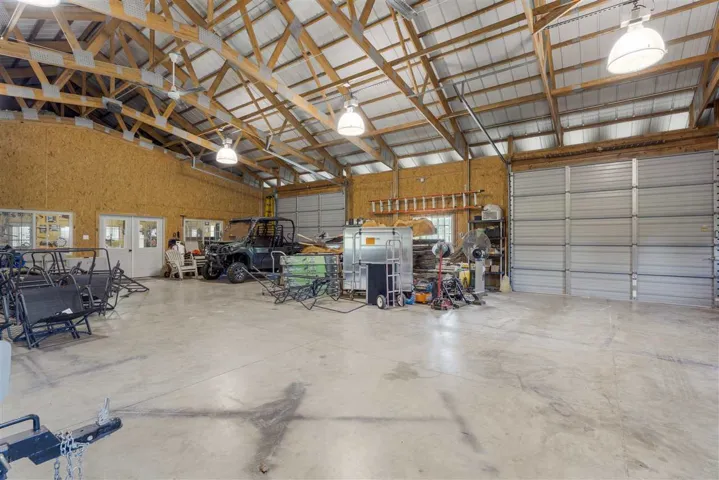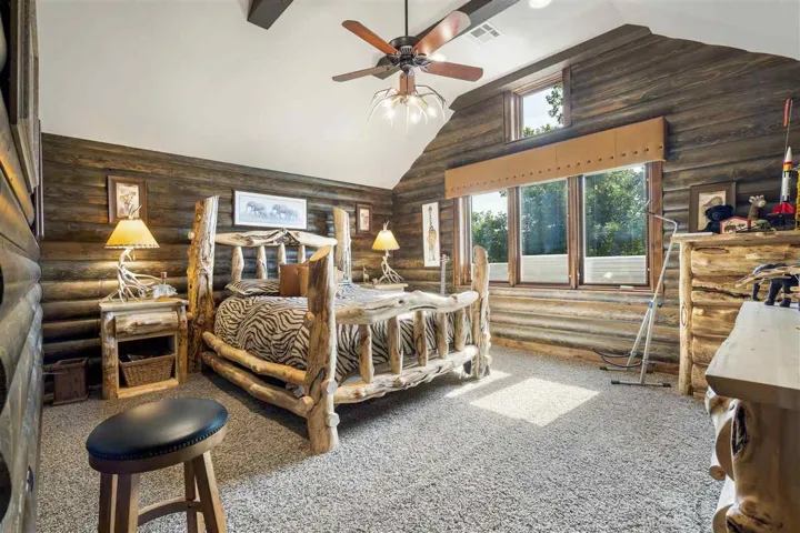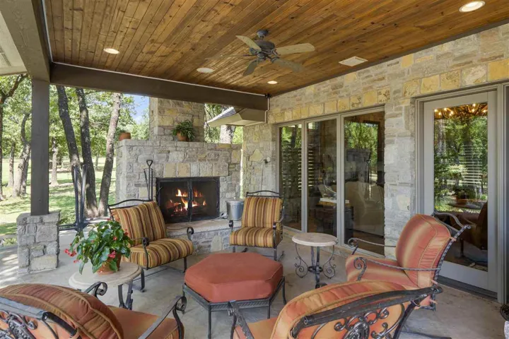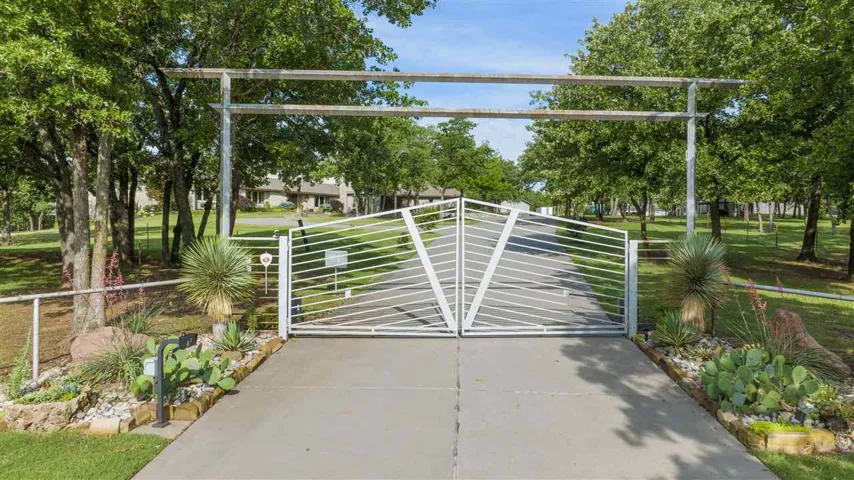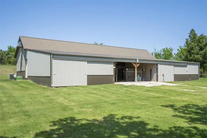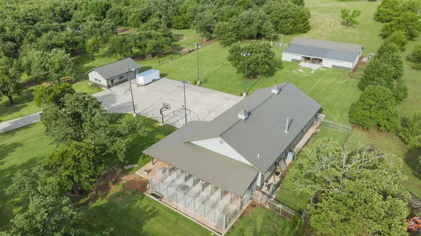 Rustic Lodge Elegance is the ultimate description of this 10-acre estate blending nature’s beauty and luxurious styling in the heart of central Oklahoma. Set behind a private gated entry, the 7400 sq. ft. home, fashioned by Ron Walker Construction and Bruce Ogle Designs, offers the finest in finishes, meticulous planning and incomparable craftsmanship. Remarkable quality greets you in the two-story Entry featuring mesquite wood double doors with iron hardware, a stunning hand-crafted, antler chandelier, hand-scraped white oak wood flooring plus a panoramic view of the beautiful outdoor entertaining area. Thoughtful design leads you to the primary living space of the residence boasting a generous Formal Dining room, Gourmet Kitchen with two bars and bay window Breakfast Dining, and expansive Great Room. The Formal Dining area, flanked by a 1000+ bottle chilled Wine Room and Butler’s Pantry, boasts split leather walls in stamped ostrich pattern, custom antler chandelier and sconces, wood beams and expansive outdoor views. The Kitchen is a chef’s dream come true featuring a stone-accented eating island, separate prep island with built-in mesquite wood butcher’s block and hammered copper prep sink, chiseled edge granite, 6-burner with griddle Wolf gas cooktop, two Wolf brand ovens with convection feature, warming drawer, two Bosch dishwashers and Thermador refrigerator/freezer with hand crafted cabinetry finish, a farmhouse sink and hand-glazed wall finishes. A sizable, walk-in Pantry doubles as a storm shelter offering another copper, prep sink and terrific storage. Soaring ceilings framed by dramatic wood beams and a two-story, stone fireplace adds natural character to the light filled Great Room. A majestic, cut stone hearth anchors this room with one-of-a-kind features such as 150-year-old reclaimed floor joist used as a custom mantel, splendid antler chandelier and hand pieced wood flooring. The private Study is rich in style with hand crafted mesquite wood wainscoating, leather walls in stamped wrinkle bull hide, stone fireplace with reclaimed western hemlock wood mantel, and custom fire screen with iron antler hinges. Serenity awaits in the Primary Bedroom Suite where you are welcomed by hand-pieced, full-hide leather flooring, panoramic views, stunning antler chandelier and indulgent Bath. Tranquility and convenience are the focus of the Bath area boasting a giant, jetted soaker tub overlooking nature, a roomy double entry shower with two main shower heads, rainmaker feature and granite seating bench, two vanities, a massive walk-through closet with glass fronted storage and ample hanging space, plus a private laundry area. The interior living space offers four more, generous en suite Bedrooms, a customized Workout area with rubber gym floor, a massive family Laundry room with double washer and dryer setup, and Hall Tree private entry. Attention to detail continues outside to a multi-level entertaining space with wood burning fireplace, natural gas stone firepit, professional Wolf gas grill and exhaust hood, slate patterned stamped concrete, tongue-n-groove pine wood ceilings and extensive custom landscaping. The home also includes a 709 sq. ft., standalone apartment perfect for extended family or guests. The estate is equipped with many outdoor facilities. The 42’ x 80’ Morton barn with approximately 1000 sq. ft. of conditioned living space offers a kitchen, half bath, and wood burning stove, plus almost 2300 sq. ft of shop area with two overhead doors, 8-run dog kennel and metal halide lighting. The 25’ x 40’ wood workshop has built-in cabinetry, independent HVAC system, one overhead door and attic storage. A 72’ x 42’ livestock barn features spray closed-cell insulation, automatic waterer and electricity. A stocked pond, 3 metal loafing/utility sheds, extensive steel and fiberglass reinforced concrete driveways, stadium lighting, and natural gas generator rounds out the exterior improvements.