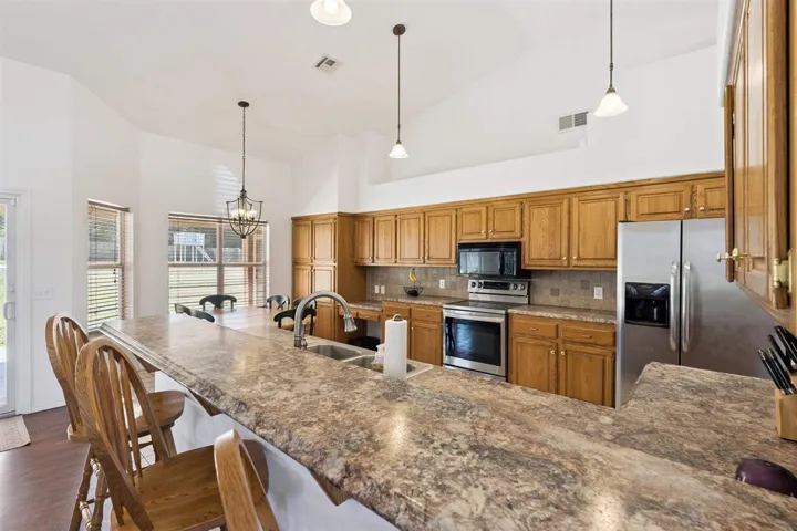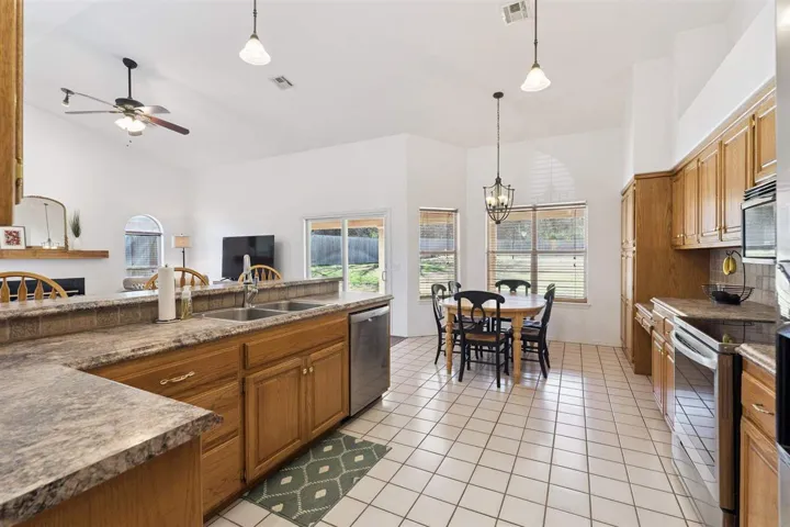Located on a quiet cul-de-sac lane in an established neighborhood, this 4-bedroom, 2-bath home sits on a spacious half-acre lot surrounded by mature trees, offering both charm and privacy. With Sangre Ridge Elementary and Stillwater Middle School just a short walk away, you’ll enjoy everyday convenience while avoiding the hassle of long school pick-up lines. Inside, vaulted ceilings and abundant natural light create a bright, airy feel throughout the home. The large, open kitchen is a true centerpiece, featuring extensive cabinetry that provides exceptional storage and functionality—perfect for both daily living and entertaining. Recent updates include a brand-new roof, adding value and peace of mind. Step outside to a covered patio ideal for relaxing or hosting gatherings, and enjoy the backyard’s concrete play pad complete with a basketball goal—perfect for recreation and outdoor fun. With its combination of space, updates, and prime location, this home offers an exceptional lifestyle opportunity in one of southwest Stillwater’s most desirable areas.