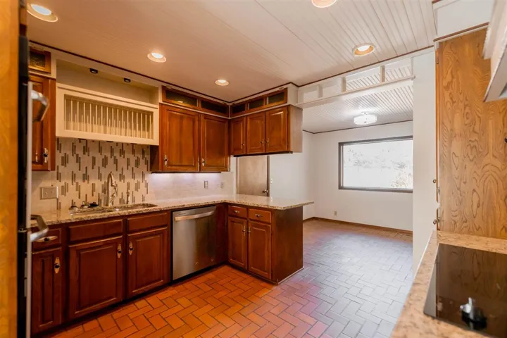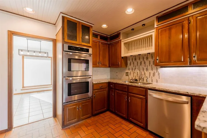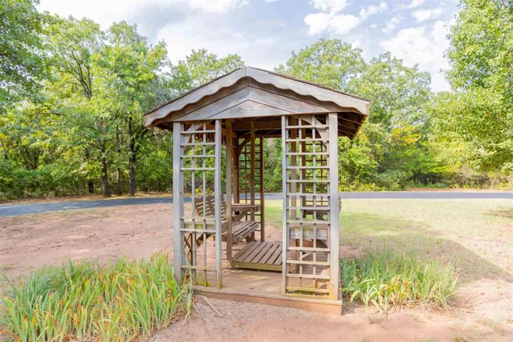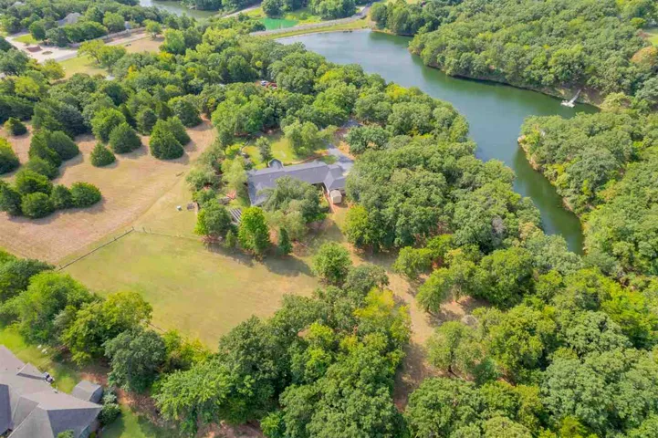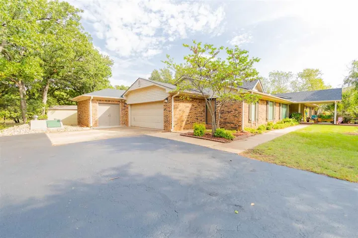 Welcome to this stunning 3-bedroom, 2-bath home offering 2,927± sq ft of beautifully designed living space, nestled on a breathtaking park-like setting with mature trees, lush landscaping, and a peaceful, private atmosphere. From the moment you arrive, the circle drive and towering shade trees create incredible curb appeal and a true estate feel. The property backs to a serene pond, offering both privacy and scenic views rarely found. Inside, the home features a spacious den with tiled flooring and a classic brick fireplace, complemented by a custom wet bar with granite countertops, sink, wine rack, and built-in cabinetry—perfect for entertaining. The kitchen is thoughtfully designed with granite surfaces, double ovens, cooktop with vent hood, pull-out drawers, decorative glass cabinetry, and a large pantry with pull-outs. Just off the front door, is a formal living/dining, perfect for extra company and gatherings. The oversized primary suite is a luxurious retreat featuring a spa-like bathroom with jetted tub, marble finishes, dual vanities, a makeup vanity, and a walk-in shower with dual heads, rain feature, and body jets. Dual walk-in closets provides ample storage and space. A versatile flex space ideal for a sitting room, nursery, or office is attached to primary suite, over-looking back yard, peaceful to grab a book or to have an evening of relaxation or morning coffee. Built-in electric fireplace and TV units add modern comfort and style. Additional features include two spacious secondary bedrooms with double closets, and one with a built-in desk area, and a private study with built-in bookshelves. Step outside and enjoy your own private outdoor oasis with multiple patio spaces, two pergolas, flower beds, archways, and a tranquil water feature—all surrounded by mature trees that create that highly sought-after park-like setting. The property also includes a 2-car garage with epoxy flooring and built-in storage, a separate bike/mancave room which is heated and cooled, storm shelter, outbuildings, slab for future shop, fenced dog yard with drive-in access, and two sprinkler systems servicing both front and back yards. Recent updates include a new roof and gutters, fresh exterior paint, and Pella windows throughout (most with built-in blinds). This one-of-a-kind property offers luxury, space, and a truly serene setting—just minutes from town while feeling like your own private retreat.