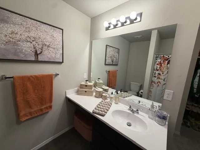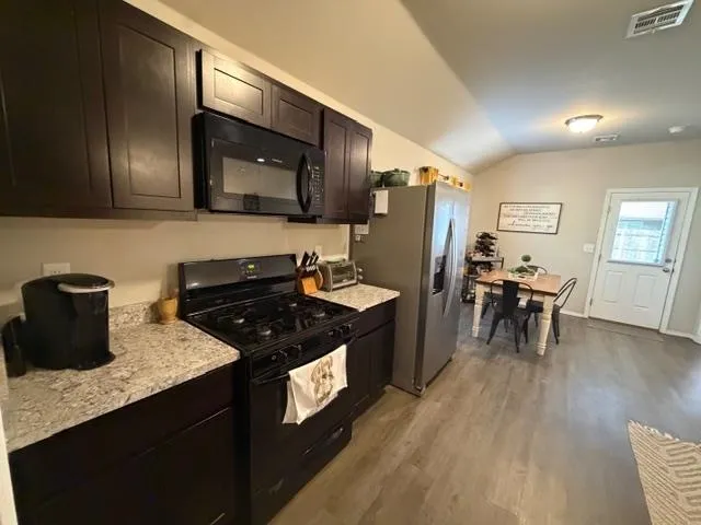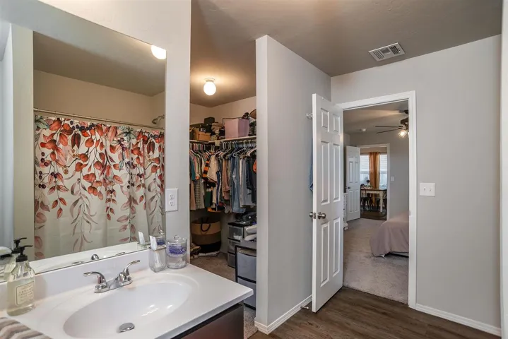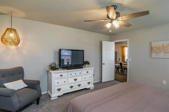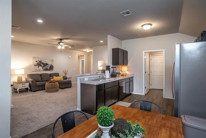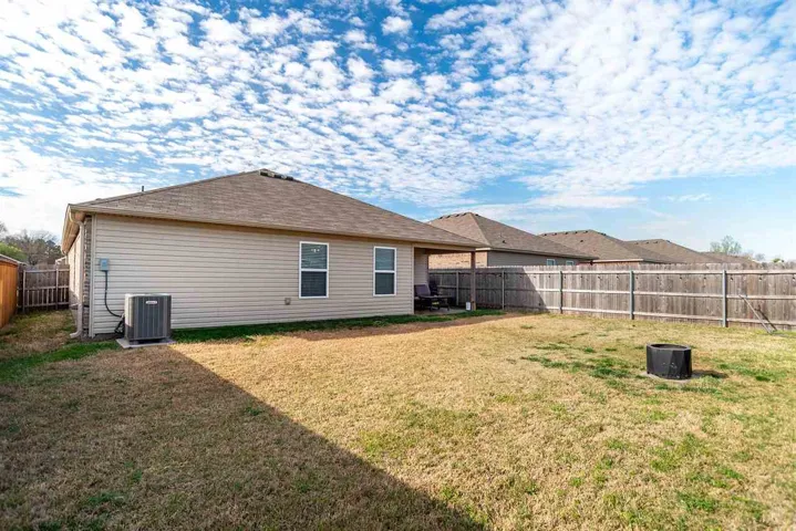 Beautifully maintained, like-new home. This 3-bedroom, 2-bath property offers a functional and inviting layout with an open-concept living, kitchen, and dining area—perfect for both everyday living and entertaining. The kitchen features ample counter space, abundant cabinetry, and a convenient breakfast bar that overlooks the spacious living room.. The primary suite is generously sized, offering plenty of room for a seating area along with a private en-suite bath and large walk in closet. The other 2 bedrooms and bath are located on other side of house for added privacy for your guests. In addition to spacious bedrooms and closets found throughout, including large pantry in laundry room. Step outside to enjoy the covered patio and fully fenced backyard with a wood privacy fence—ideal for relaxing, pets, or gatherings. Conveniently located within walking distance to the elementary and junior high schools, this home offers both comfort and accessibility. Move-in ready and well cared for, this is one you won’t want to miss!