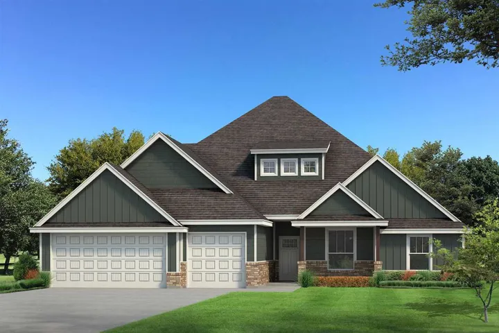 This Poppey Bonus Room 5 Bedroom floor plan includes 3,700 Sqft of total living space, which includes 3,350 Sqft of indoor living and 350 Sqft of outdoor living. This home offers 5 bedrooms, 3 full baths, a powder room, a bonus room, a study, a utility room featuring a utility sink and Paros Hex flooring, 2 dining areas, and a 3-car garage with carriage doors and an in-ground storm shelter installed. The great room presents a breathtaking coffered ceiling with crown molding and a ceiling fan, wood-look tile, large windows, rocker switches, eggshell paint throughout, an electric fireplace with a stacked stone detail, and Cat6 wiring. The high-end kitchen supports 3 CM countertops, well-crafted cabinets to the ceiling with under cabinet lighting and cabinet hardware installed throughout, stainless steel appliances, an electric cooktop, double ovens, a center island with a trash can pullout, gleaming tile backsplash, a separate corner pantry, and stunning pendant lighting. We also included a 3-panel sliding door with a 4’ back patio extension at the breakfast nook. The primary suite boasts a sloped ceiling with a fan, windows, Cat6 wiring, and our cozy carpet finish. The spa-like primary bath features separate vanities with framed mirrors, 3 CM countertops, a private water closet, a free-standing tub, a European walk-in shower, modern tile flooring, and a HUGE walk-in closet. Secondary bedrooms feature ceiling fans, windows, sizeable closets, and carpeted flooring. The covered outdoor living area includes a wood-burning fireplace, a TV hook up, and upgraded landscaping. Other amenities include our healthy home technology, a 75-gallon water heater, an electric air handler, R-44 insulation, and so much more.