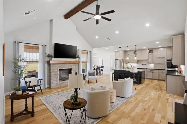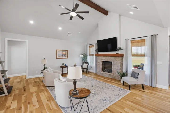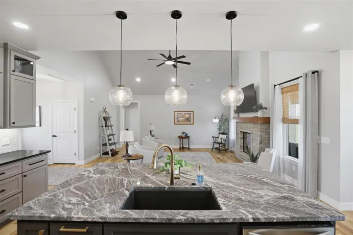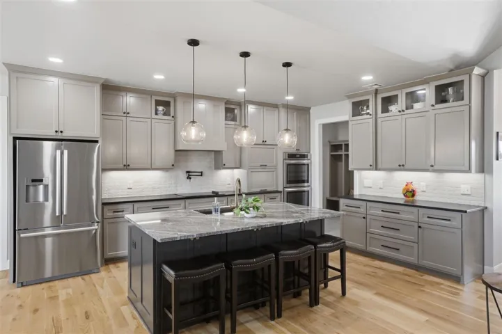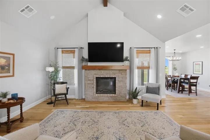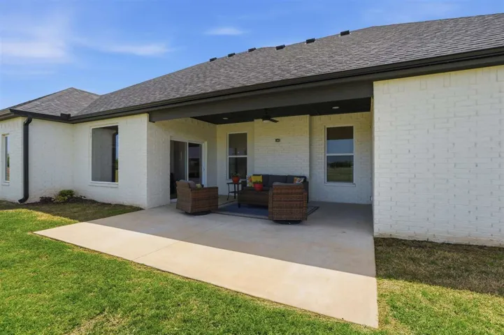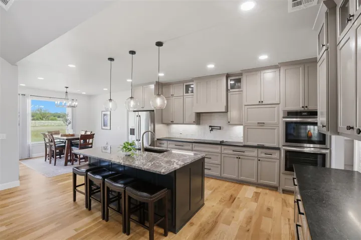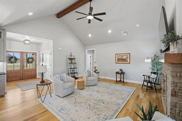 Experience refined living in this *better-than-new* custom home in the desirable Trio Ridge subdivision. Built in 2024, one of only four homes built by premier builder CTH Construction in Trio Ridge. This exceptional 4-bedroom, 2.5 bathroom residence offers 2,326 square feet of thoughtfully curated space on a generous 0.50-acre lot, complete with an oversized 2-car garage with an additional single car garage. From the moment you arrive, the home’s inviting covered porch and elegant glass French entry doors set the tone for what awaits inside. Rich white oak hardwood floors grown and milled in Oklahoma, soaring vaulted ceilings, and a stunning stone fireplace with pasture views create a warm yet sophisticated atmosphere in the main living area. At the heart of the home, the chef’s kitchen blends beauty and function with a large island offering seating and abundant storage, double ovens, stainless steel appliances, a custom vent hood, and a walk-in pantry. Two cleverly concealed appliance garages provide a seamless, uncluttered look—perfect for a microwave, coffee bar, or everyday essentials. The private primary suite is a serene retreat, filled with natural light and accented by beautiful wood flooring. The spa-inspired ensuite bath features dual vanities, generous space to unwind, and an impressive tiled walk-in shower with a wet/dry design. Never a cold shower, this home is equipped with a recirculating hot water pump system. Designed with everyday living in mind, the mudroom/utility area just off the garage is exceptionally well-appointed with built-in lockers, a storage closet, a dedicated laundry room with sink and ample storage, a convenient half bath, and direct access to the pantry and kitchen—making organization effortless. Three additional bedrooms and a well-placed guest bath are situated in their own wing, offering privacy and flexibility for family or guests. The oversized 2-car garage is equally impressive, featuring built-in storage, while the additional single car garage includes an in-ground storm shelter and a service door leading to the backyard. Step outside to your north-facing covered patio with extended concrete, designed for year-round enjoyment. Whether hosting gatherings, watching the big game, or simply relaxing under the stars, you’ll appreciate the peaceful backdrop of open pasture—often visited by grazing cattle and horses—creating a tranquil, countryside feel. With established yard, landscaping, window coverings, and premium upgrades already in place, this home offers the rare opportunity to enjoy the benefits of new construction without the wait. Move in and start enjoying your Stillwater summer in style.