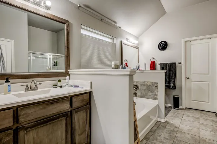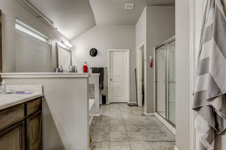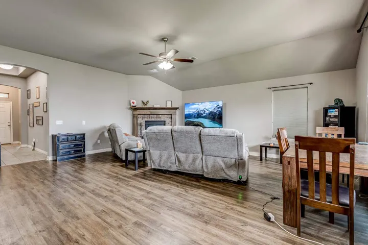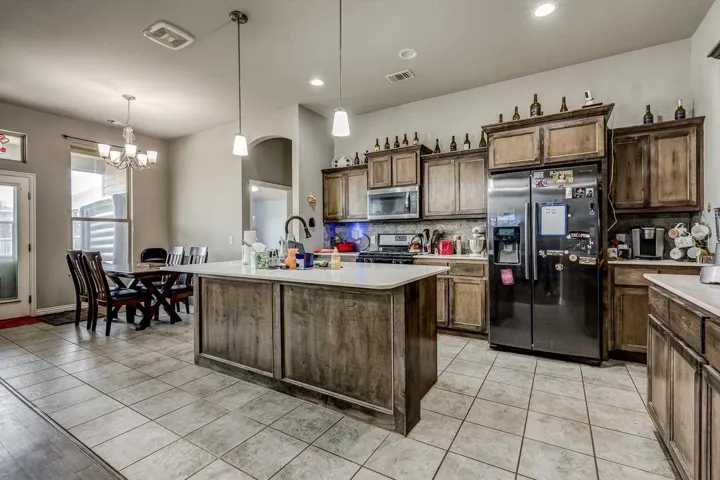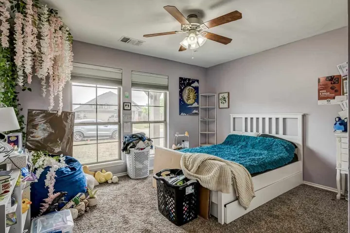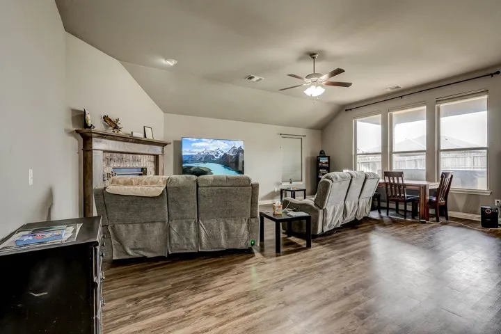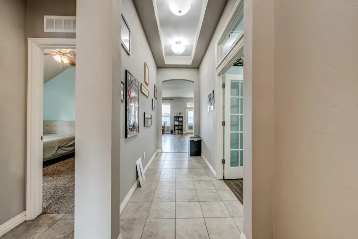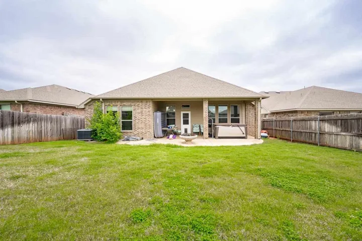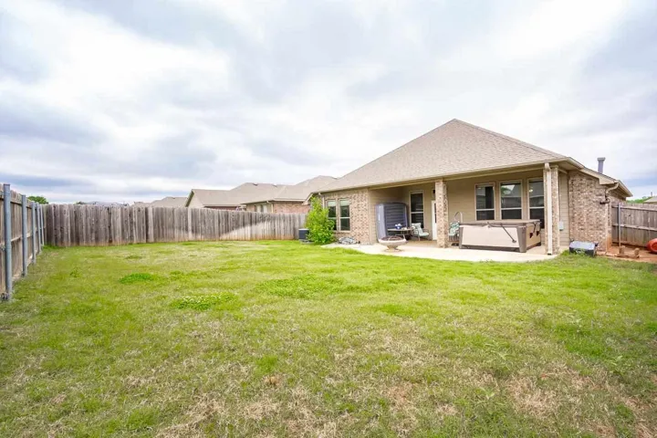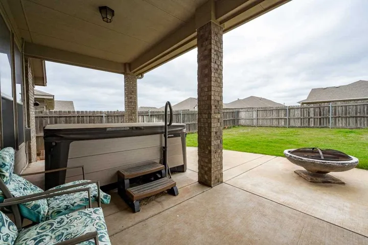 THREE BEDROOMS PLUS STUDY IN THIS 2228 SQ FT HOME. Enter the home from an attractive covered front porch. When you open the front door you will see a gorgeous foyer/ long hallway with a extra high coffered ceiling. Off of this hallway is the study on one side with the 2nd bedroom, 3rd bedroom and 2nd bath on the other side. The large living has a brick fireplace with gas logs, LVP flooring, 10 ft ceilings and large windows to enjoy the view and light. It is open to the kitchen dining and kitchen itself. The kitchen has a large island, maple cabinets, quartz countertops with stone backsplash, stainless steel appliances and ample storage. Off of the kitchen is a large walk in pantry, built in locker system and large laundry room. The large, isolated primary bedroom leads to the spacious bathroom. It has two vanities, tub, walk in shower and walk in closet. The back has a covered patio with extra space uncovered with a stylish curved design. It has a wooden privacy fence and the Hot Springs brand hot tub will remain with the property. Other features are a full yard sprinkler system, guttering on the home and a storm shelter in the garage.